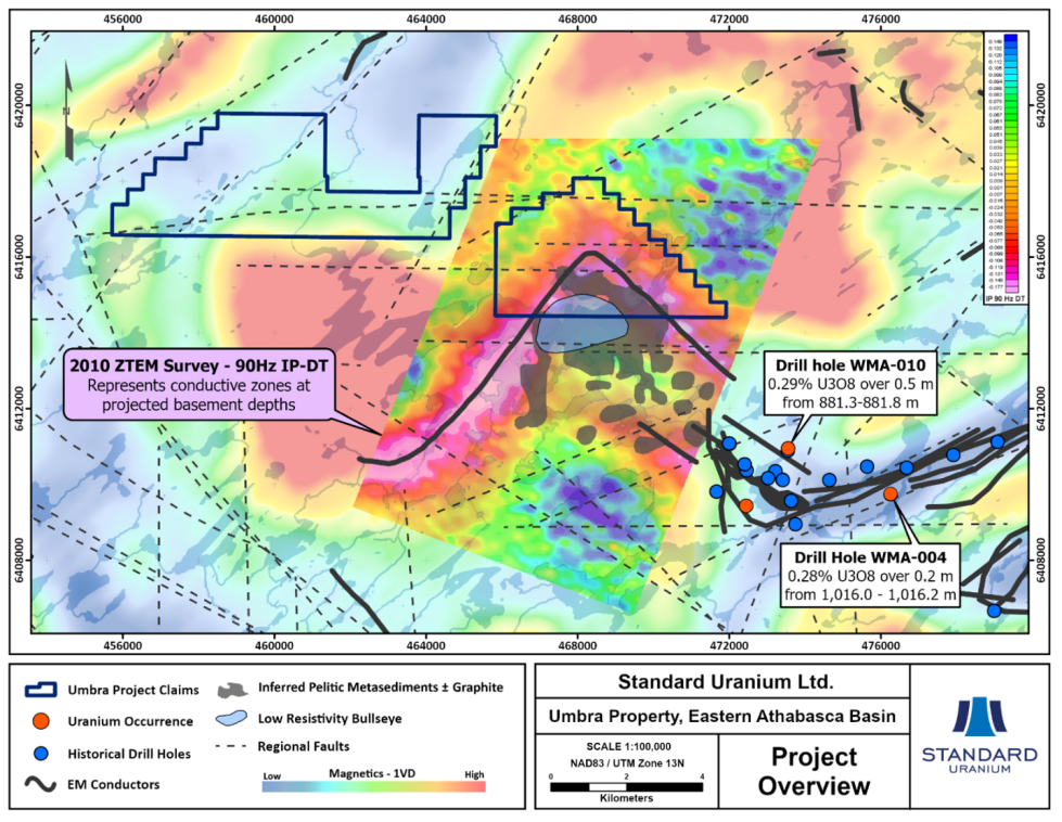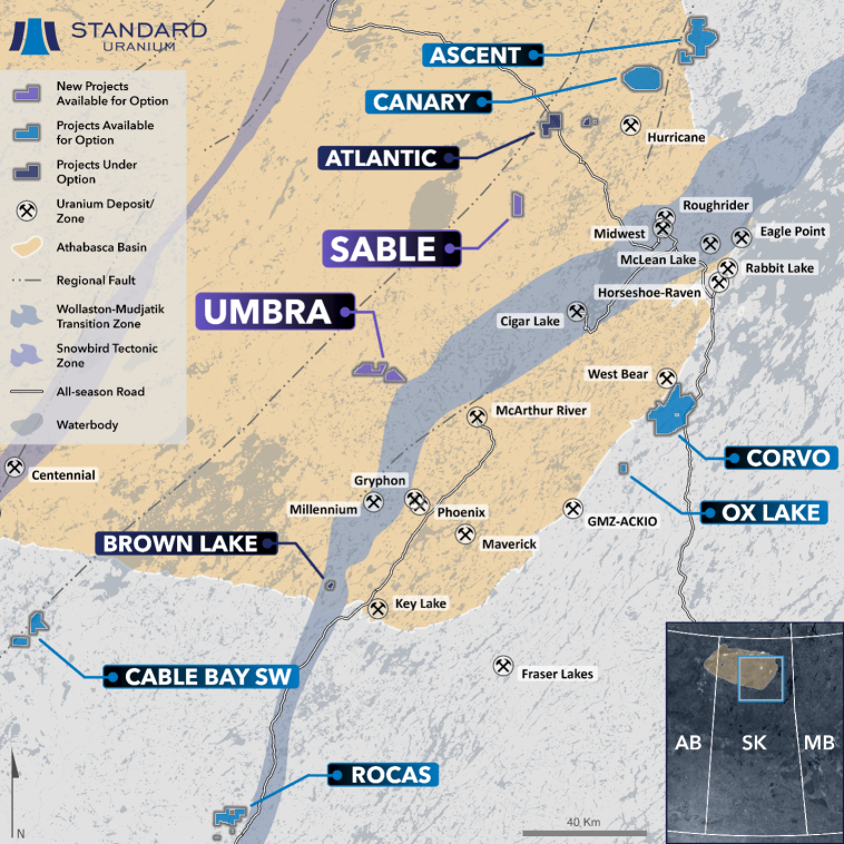 Vancouver, British Columbia, January 16, 2025 — Standard Uranium Ltd. (“Standard Uranium” or the “Company”) (TSX-V: STND) (OTCQB: STTDF) (Frankfurt: FWB:9SU) is pleased to announce the acquisition of the Umbra and Sable uranium projects in the prolific eastern Athabasca Basin, covering 3,680 and 1,590 hectares, respectively. The projects were acquired via low-cost staking and are now available for joint venture option agreements.