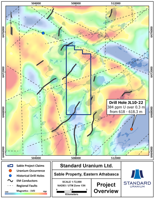 The Sable project is comprised of a single mineral claim totalling 1,590 hectares, located 35 km NW of the Cigar Lake uranium mine and approximately 42 km SW of the Hurricane uranium deposit (Figure 1). Sable covers two NE-SW trending magnetic lows, interpreted to represent prospective metasediments within folded granitic rocks (Figure 3). The inferred conductors extend over a strike length of more than 3 kilometres and remain untested by drilling.