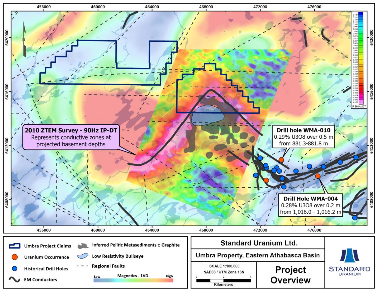 Standard Uranium's Sun Dog project, in the northwest part of the Athabasca Basin, Saskatchewan, comprises nine mineral claims over 19,603 hectares. The Sun Dog project is highly prospective for basement and unconformity hosted uranium deposits yet remains largely untested by drilling despite its location proximal to uranium discoveries in the area.