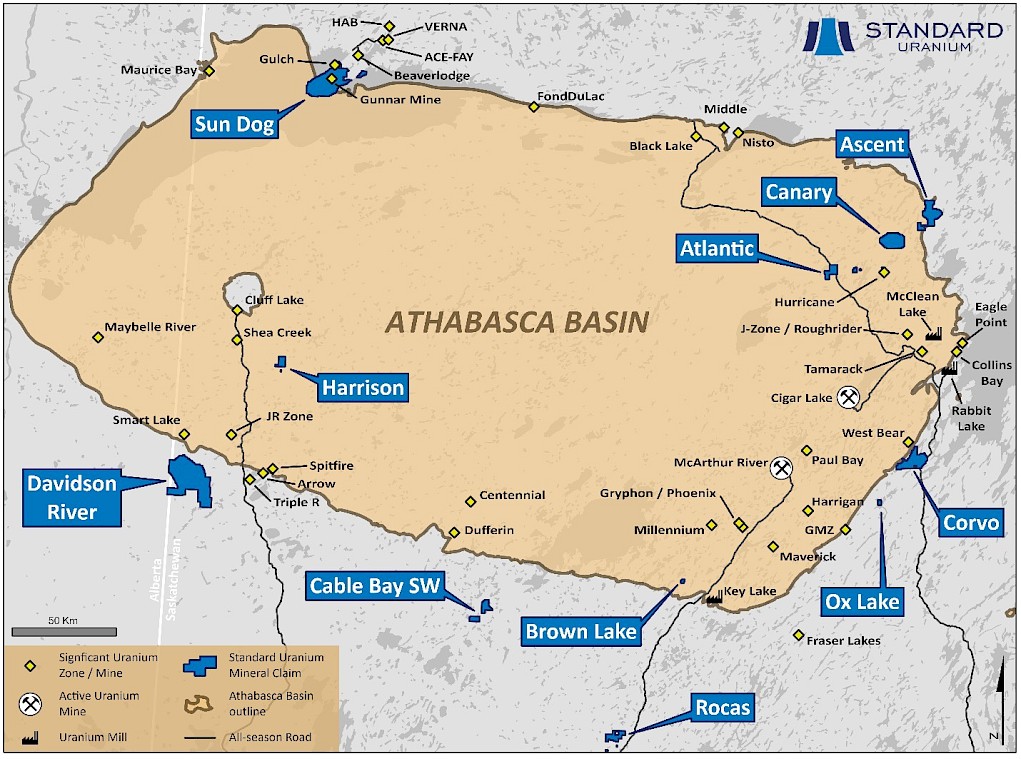 Figure 1. Overview map of Standard Uranium’s eleven Athabasca properties, including the newly staked Harrison project.