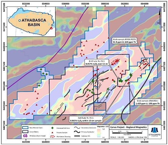 Vancouver, British Columbia, August 24, 2023 — Standard Uranium Ltd. (“Standard Uranium”, “Standard” or the “Company”) (TSX-V:STND) (OTCQB: STTDF) (Frankfurt: FWB:9SU) is pleased to announce the Company’s wholly-owned subsidiary, Standard Uranium (Saskatchewan) Ltd., has entered into a mineral property purchase and sale agreement (the “Purchase Agreement”), dated effective August 24, 2023, with Eagle Plains Resources Ltd. (“Eagle Plains”), pursuant to which the Company will acquire eight additional mineral claims totalling 4,278 hectares contiguous with the recently staked Corvo Project, in the Eastern Athabasca Basin region (the “Acquisition”). Upon completion of the Acquisition, the Corvo Project will comprise 7,989 hectares within ten claims and contain 14.5 km of prospective exploration corridors across two trends. Standard Uranium continues to implement their project generator growth strategy, further adding to the already considerable land package in the Athabasca basin through expansion and acquisition opportunities.