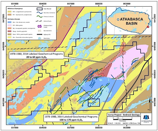 The Corvo Project is situated 1.5 kilometres outside the current margin of the Athabasca Basin, approximately 50 kilometres southwest of Rabbit Lake mill facilities and 45 kilometres northeast of the Gemini Mineralized Zone (Figure 1).