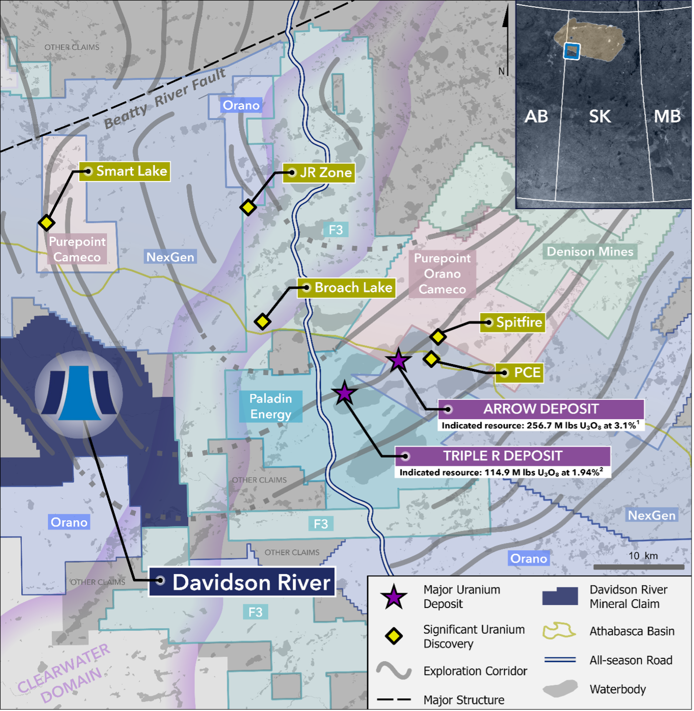 Davidson River covers 30,737 hectares of prime exploration real estate in the Southwest Athabasca Uranium District, highly prospective for basement-hosted uranium deposits along trend from high-grade* uranium deposits under development (Figure 1).