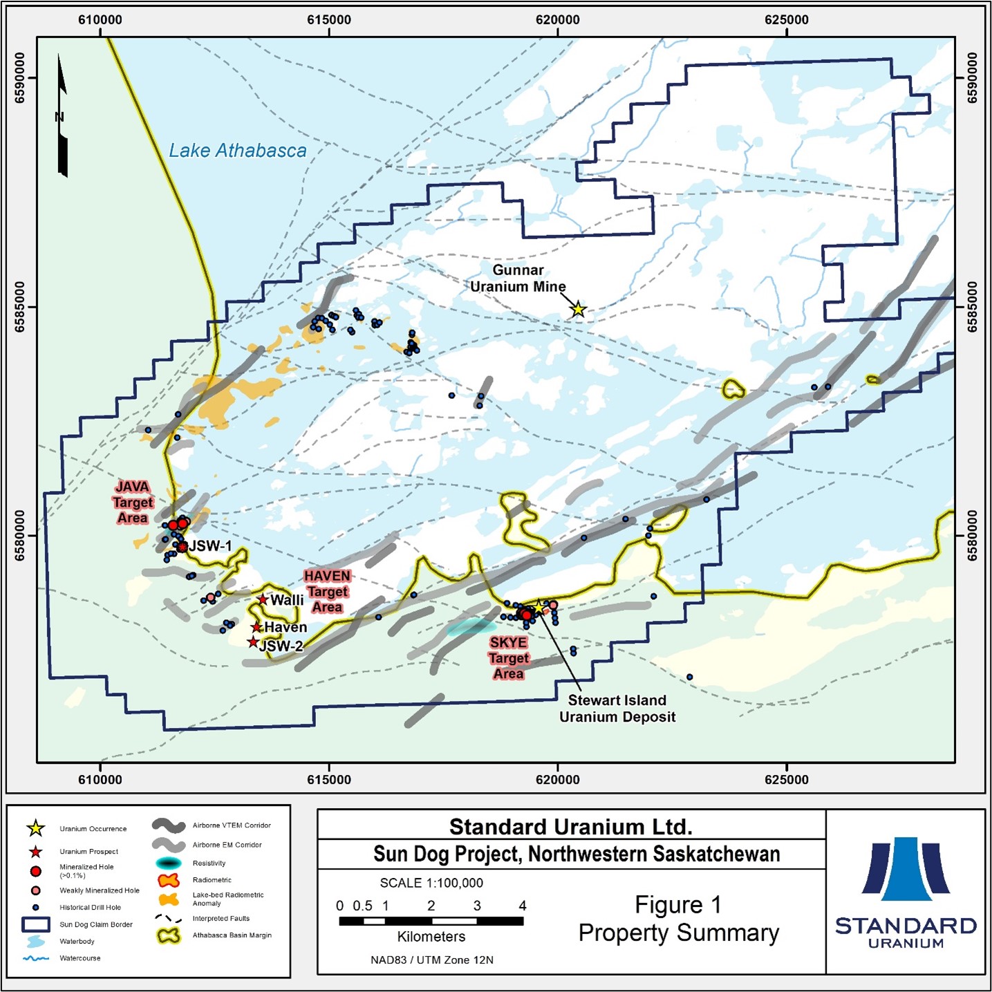 Vancouver, British Columbia, October 19, 2021 — Standard Uranium Ltd. (“Standard Uranium” or the “Company”) (TSX-V: STND) (OTCQB: STTDF) (Frankfurt: FWB:9SU) is pleased to announce the signing of an Engagement Agreement with Ya’thi Néné Land and Resource Office (“YNLR”)1 , further strengthening the Company’s relationships with First Nations and northern community stakeholders. The Company is also pleased to announce plans for their winter exploration program including high resolution geophysics and diamond drilling at its 15,770-hectare, 100% wholly-owned, Sun Dog Project (the “Project”). The Project is located at the northwestern edge of the Athabasca Basin, Saskatchewan, and is south of the first uranium mining camp in Canada, the Beaverlodge District, near Uranium City.