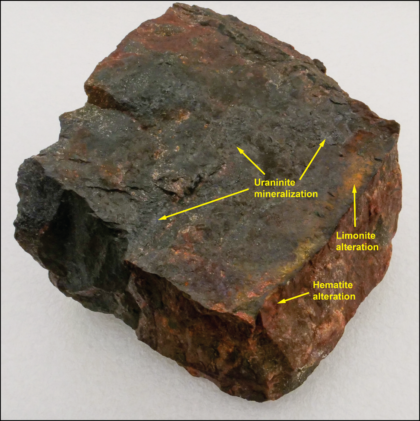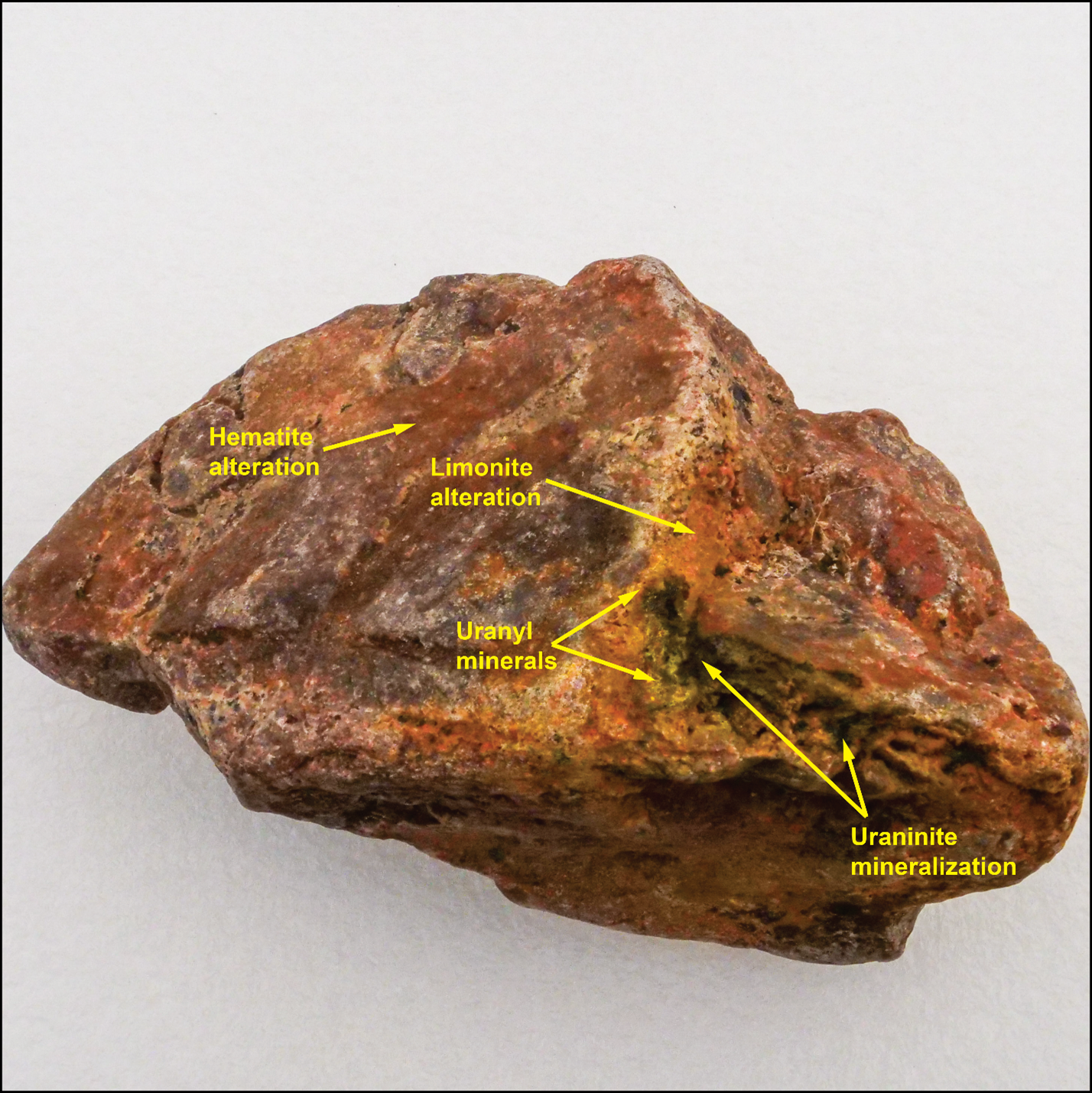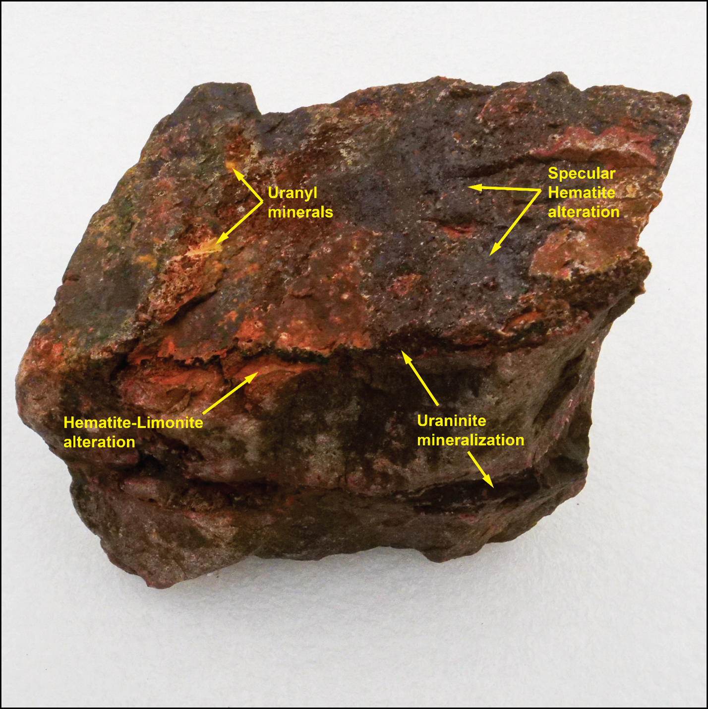 Figure 4. Boulder grab sample from the Skye target area containing vein- and bedding-controlled uraninite mineralization associated with strong to intense hematite-limonite alteration. Local dark purple-red specular hematite and secondary yellow-orange uranyl minerals are noted along the fracture surface at the top of the sample; Sample size: 8 cm x 13 cm x 7 cm; Up to 12,000 counts per second.
