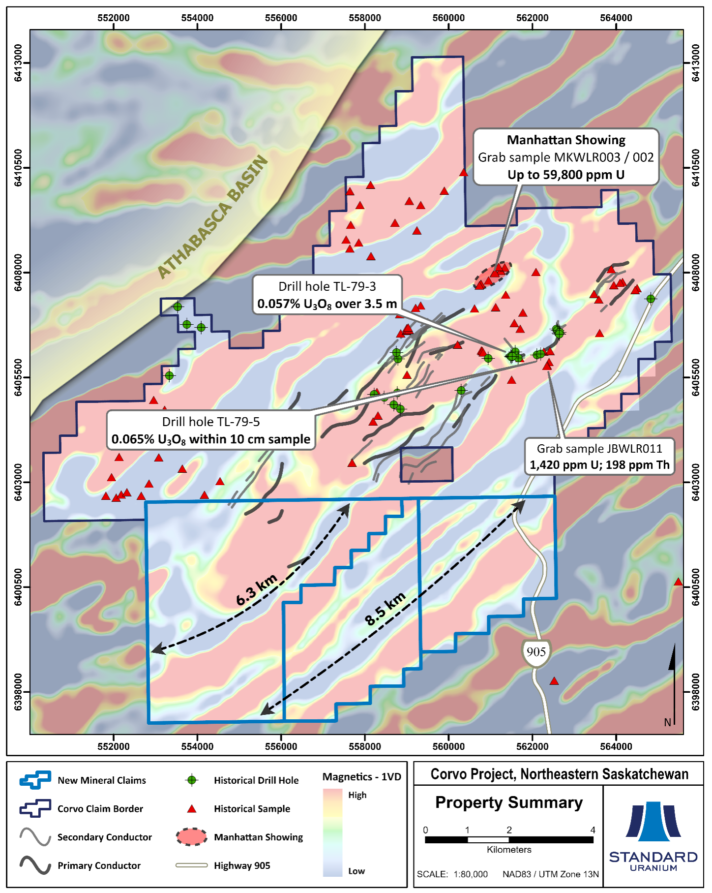 Vancouver, British Columbia, September 24, 2024 — Standard Uranium Ltd. (“Standard Uranium” or the “Company”) (TSX-V: STND) (OTCQB: STTDF) (Frankfurt: FWB: 9SU) is pleased to announce the expansion via low-cost staking of the Corvo uranium exploration project in the eastern Athabasca Basin region, northern Saskatchewan. The Company has strategically added three new mineral claims to the Project increasing the size of Corvo from 7,989 hectares to 12,265 hectares, providing a high-value uranium project available for option.