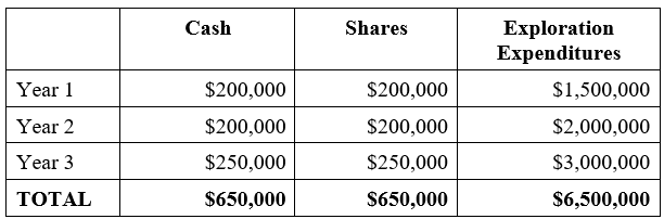 Pursuant to the terms of the Option Agreement, the Optionee must first compete a going public transaction within 90 days of signing this agreement. Following that, the Optionee can acquire the Sun Dog Project by making cash payments, issuing shares, and incurring exploration expenditures over the next three years as follows: