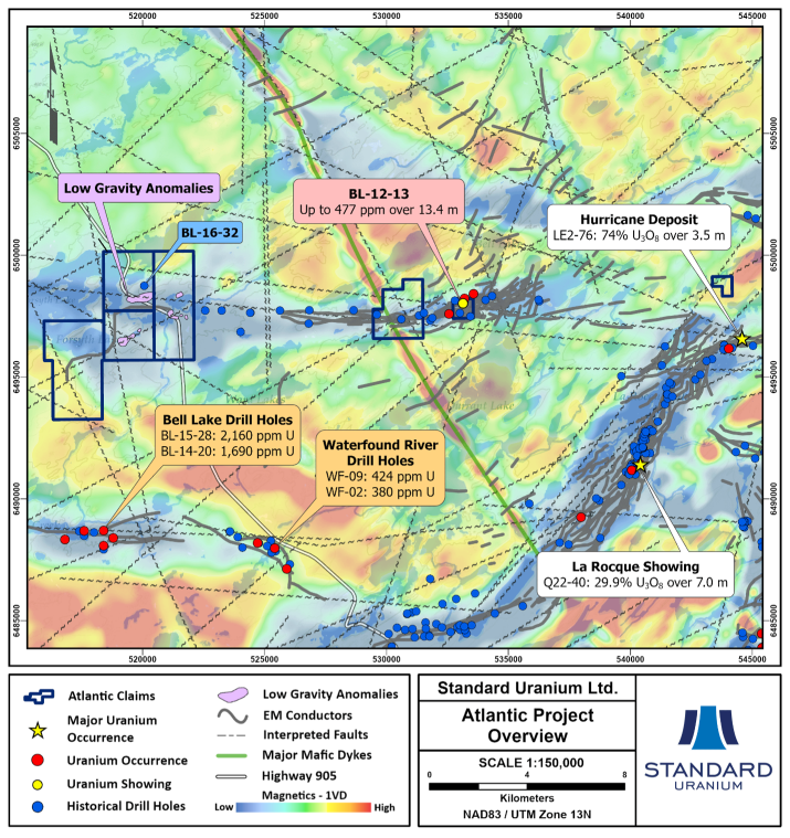 Figure 1. Regional summary map of the Atlantic Project highlighting nearby uranium occurrences, historical drill holes, geophysical anomalies, and EM conductors.