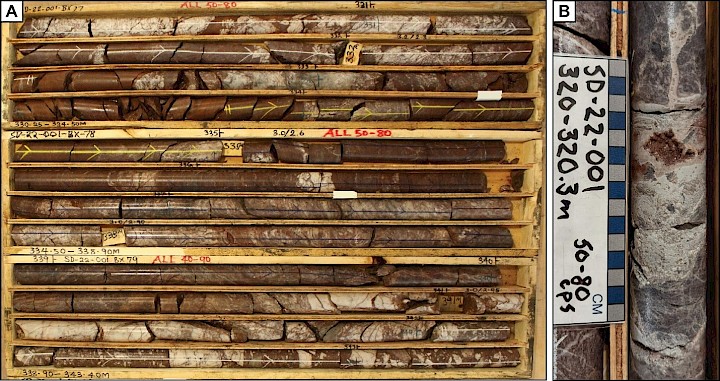 Figure 2. A) Metre-scale hydrothermal quartz-hematite breccias intersected in SD-22-001 basement rocks indicating repeated deformation and strong fluid flow in the Haven area. B) Hydraulic breccia containing white clay, dravite(?), and hematized druzy quartz in SD-22-001; 50-80 cps.