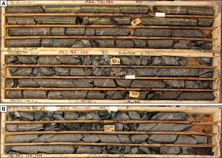 Figure 4. A) Brittle fault zone overprinting moderately clay-chlorite altered orthogneiss from 84.0 to 88.5 m in SD-22-004; up to 140 cps. B) Semi-brittle fault intersected from 146.8 to 150.5 m in SD-22-004 overprinting moderately altered orthogneiss; up to 140 cps.