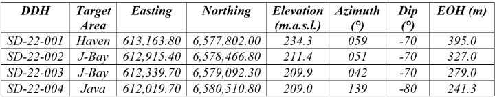 Table 1. Winter 2022 drill hole collar summary. Easting and Northing coordinates are reported in UTM Zone 12N,