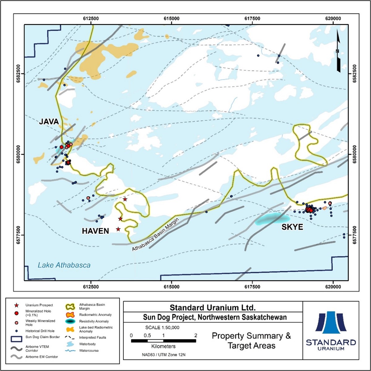 The Company has received the results of a high-resolution ground gravity survey completed over the Skye, Haven, and Java target areas on the Project, further refining high-priority uranium drill targets across the 15,770-hectare property (Figure 1). Several gravity-low anomalies have been identified and coincide with breaks or flexures in electromagnetic (EM) conductors under Athabasca sandstone cover, providing compelling ready-to-drill unconformity-related uranium targets. The Standard Uranium team arrived at the Project on March 1st, and drilling commenced at the first Skye target drill hole on March 4th, 2022. In addition, a high-resolution UAV magnetic survey will be carried out over the coming days to add further geological context to this season’s drill targets which are locally following up on known high-grade1 uranium mineralization.