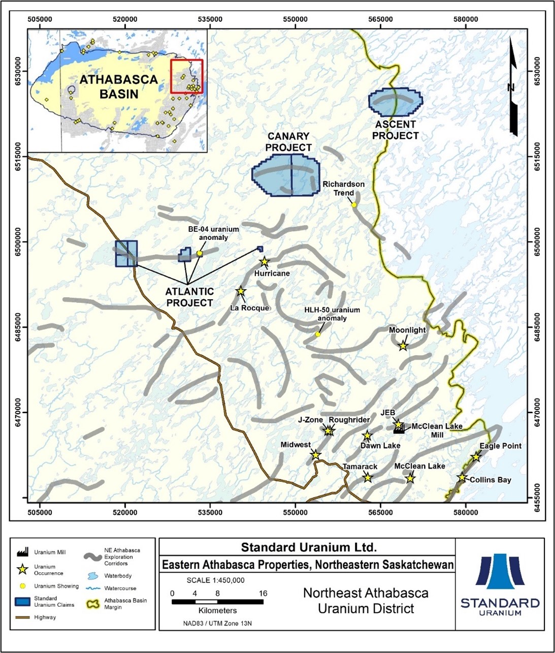 Figure 3. Plan map highlighting Standard Uranium’s East Side Projects and exploration trends, with respect to current uranium showings, discoveries, and deposits.