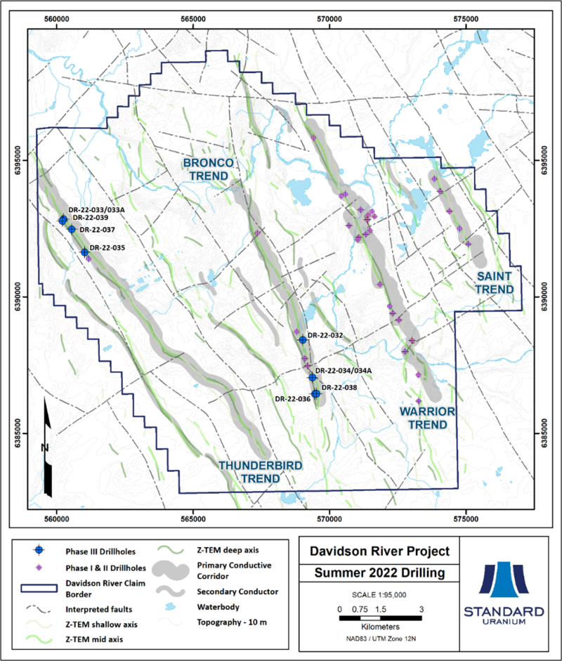 Vancouver, British Columbia, July 21, 2022 — Standard Uranium Ltd. (“Standard Uranium” or the “Company”) (TSX-V: STND) (OTCQB: STTDF) (Frankfurt: FWB:9SU) is pleased to announce that the spring/summer drill program on the Company’s flagship Davidson River Project (“Davidson River” or the “Project”) has been successfully completed ahead of schedule, under budget, and with intersections of elevated radioactivity. The 25,886-hectare Project is situated within the Southwest Athabasca Uranium District of Saskatchewan. The focused drill program followed up on prospective structures and alteration intersected during previous programs and tested brand new target areas.
