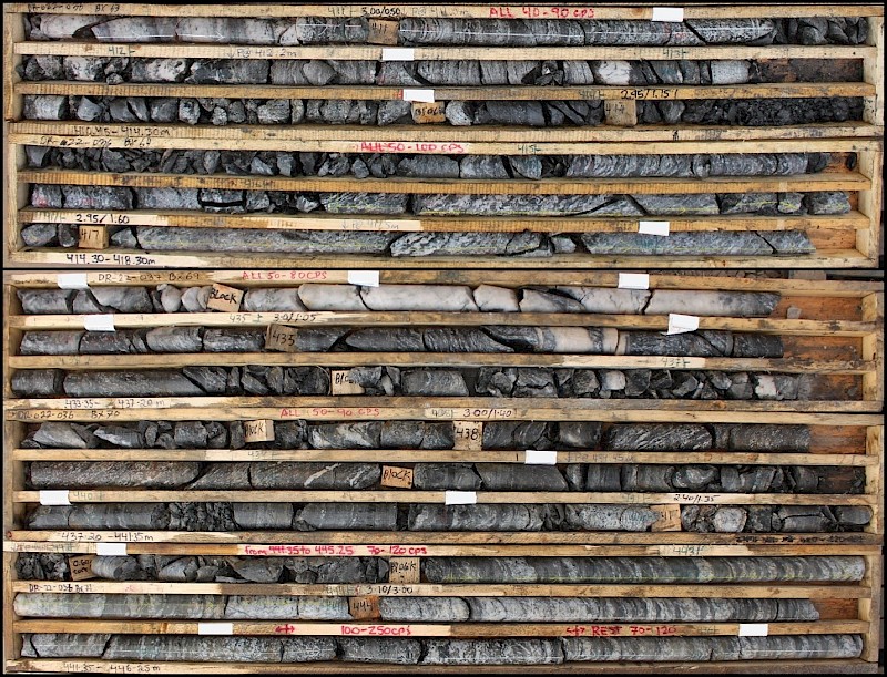 - Elevated radioactivity intersected from 445.25 to 445.75 m; reaching 250 cps.