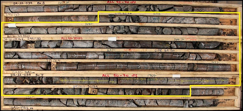 Figure 5. Elevated radioactivity within the lower shear zone of stacked graphitic structures intersected in DR-22-038 (yellow outlines); Up to 300 cps. Strong reactivation is evident through the structures, indicated by formation of fault gouge and brecciation. Sericitic alteration is present throughout the zones in addition to smoky quartz veins.