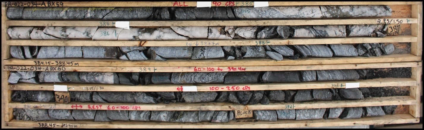- Elevated radioactivity intersected from 390.4 to 391.4 m within the structure, reaching 250 cps (Figure 3).
