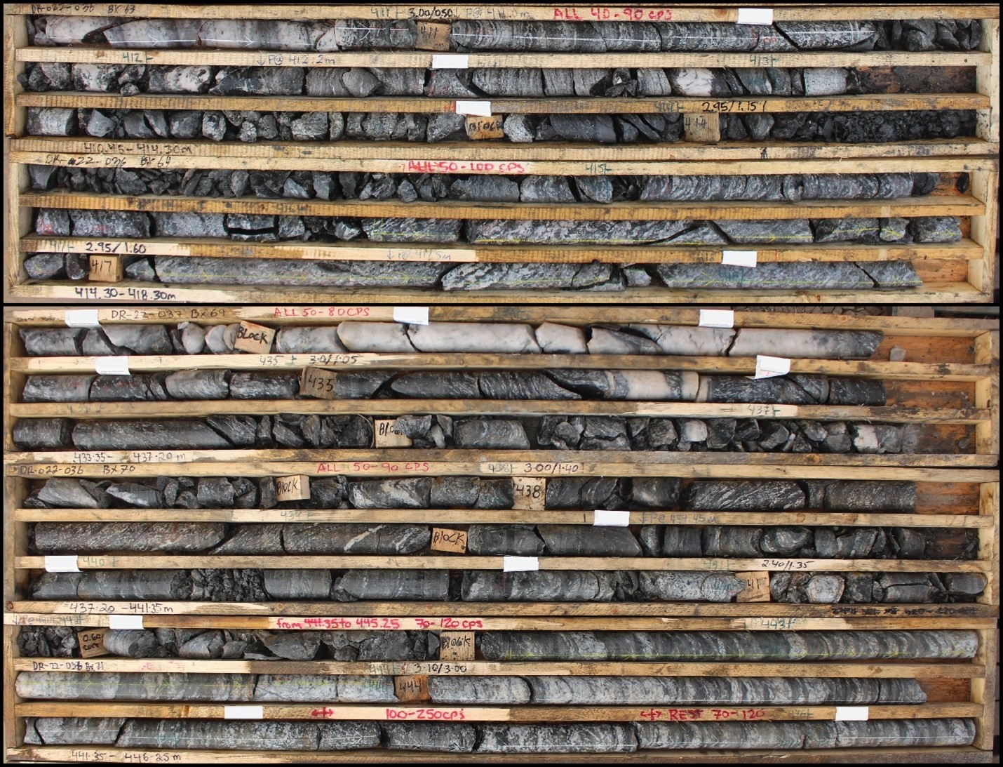- Intersection of significant graphitic structure zone with sericitic alteration and local cataclastic fault gouge from 412.0 to 442.5 m (Figure 4).