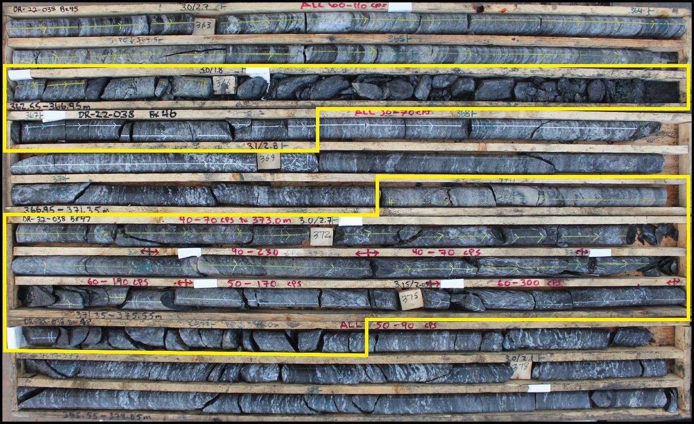 Figure 5. Elevated radioactivity within the lower shear zone of stacked graphitic structures intersected in DR-22-038 (yellow outlines); Up to 300 cps. Strong reactivation is evident through the structures, indicated by formation of fault gouge and brecciation. Sericitic alteration is present throughout the zones in addition to smoky quartz veins.