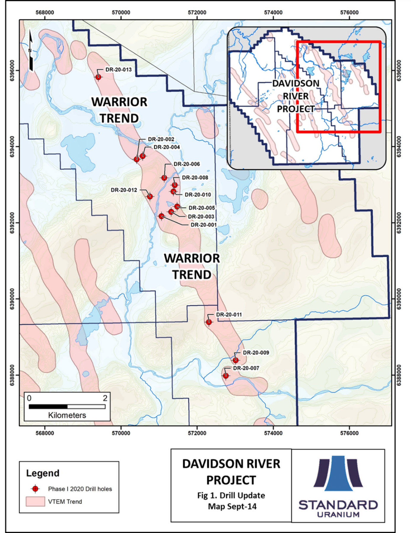 Vancouver, British Columbia, September 16, 2020 — Standard Uranium Ltd. (“Standard Uranium” or the “Company”) (TSX-V: STND) (Frankfurt: FWB:9SU) is pleased to announce completion of the Phase I summer 2020 diamond drilling program, at its flagship 25,886 hectare Davidson River Uranium Project (the “Project”). The Project is located in the Southwest Athabasca Uranium District of the Athabasca Basin, Saskatchewan, and runs along the inferred trend of Fission Uranium’s Triple R deposit and NexGen’s Arrow deposit, in an area lying 25 to 30 km to the west of those deposits.