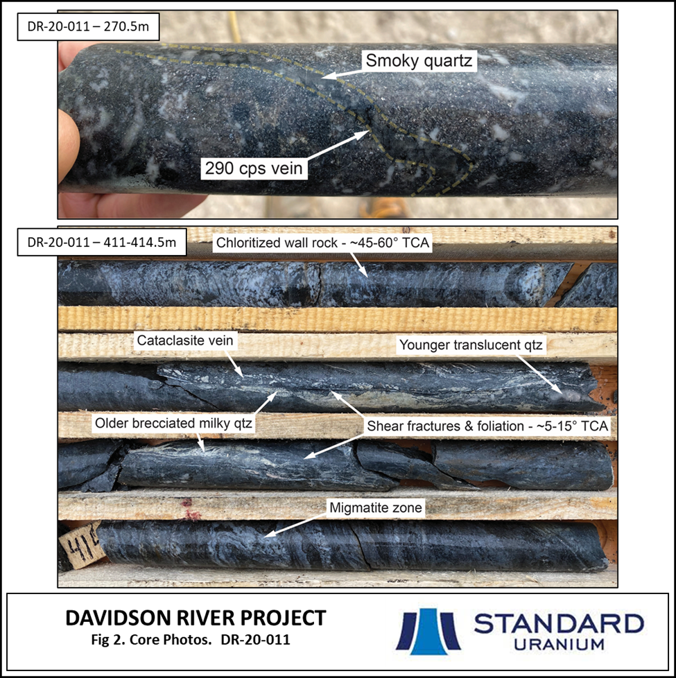 - Anomalous radioactivity (>200 cps on handheld RS-125 super-spec scintillometer) has been encountered in multiple pegmatitic bodies in the basement rocks, as well as associated with a crosscutting vein containing smoky quartz in DR-20-011. The significant brittle-reactivated graphitic shear zone intersected by DR-20-011 has similar characteristics to that intersected in hole DR-20-009, and further adds to the technical success of the SE Warrior drill holes.