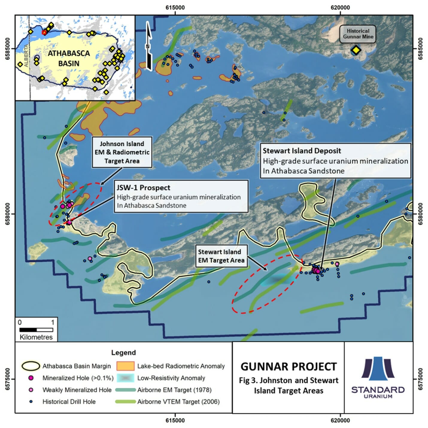 At the north-west end of Johnston Island is the historical JNW-1 prospect. This Athabasca sandstone-hosted mineralization has been sampled on the surface with results of 0.43% U3O8 over 4.2 m and 0.25% U3O8 over 1.5 m. Samples as high as 12.4% U3O8 were collected. The immediate area of the JNW-1 prospect was drill-tested with 14 drill holes, two of which were mineralized (DDH-3: 0.25% U3O8 over 1m and DDH-5: 0.163% U3O8 over 1 m). Subsequent historical drilling about 500 metres to the north of this prospect intersected minor uranium mineralization within several drill holes that intercepted strongly altered and brecciated, chlorite-, sulphide-, and graphite-bearing metasediments below the Athabasca sandstones. The best hole of the area, LAO-1, contains 0.10% U3O8 over 1 metre. Compilation of this work has revealed un-tested targets in either direction of the 1.6 km strike length of the EM Targets, and there is a large lake-bed radiometric anomaly that continues for 600 metres in the northeast direction (Figure 3).