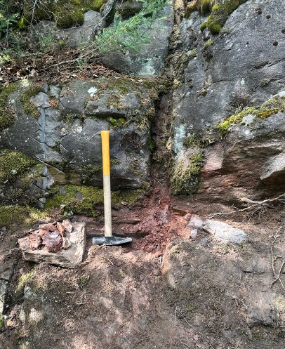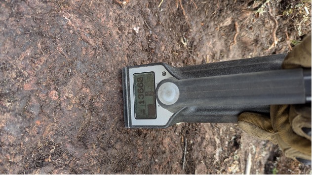 Figure 4. Newly discovered hematized magnetite-rich pegmatitic orthogneiss reaching upwards of 13,500 cps, in the T-Lake area.