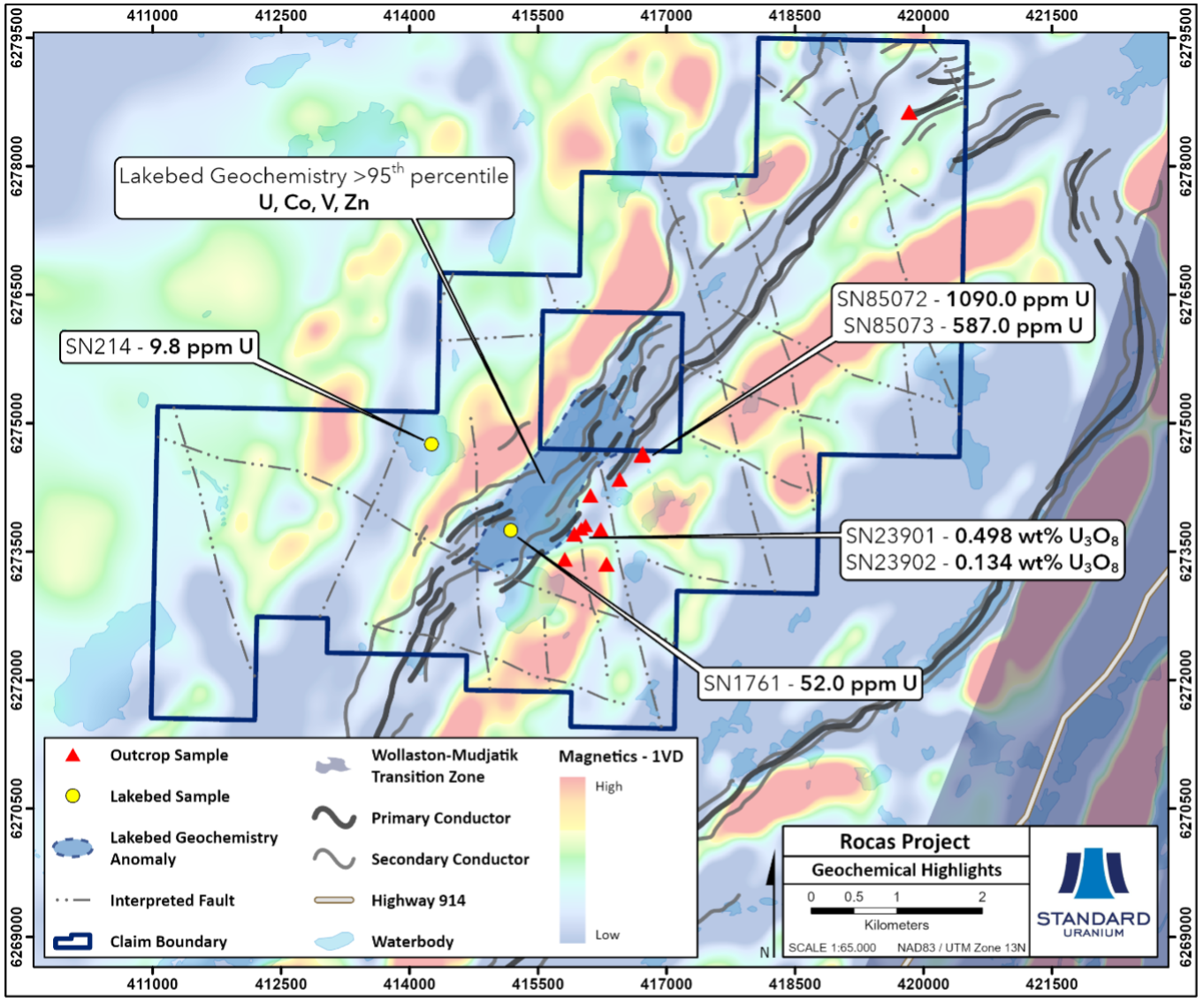 Figure 2. Geophysical map of the Rocas Project highlighting EM conductors, faults, historical uranium showings, and anomalous lakebed geochemistry.