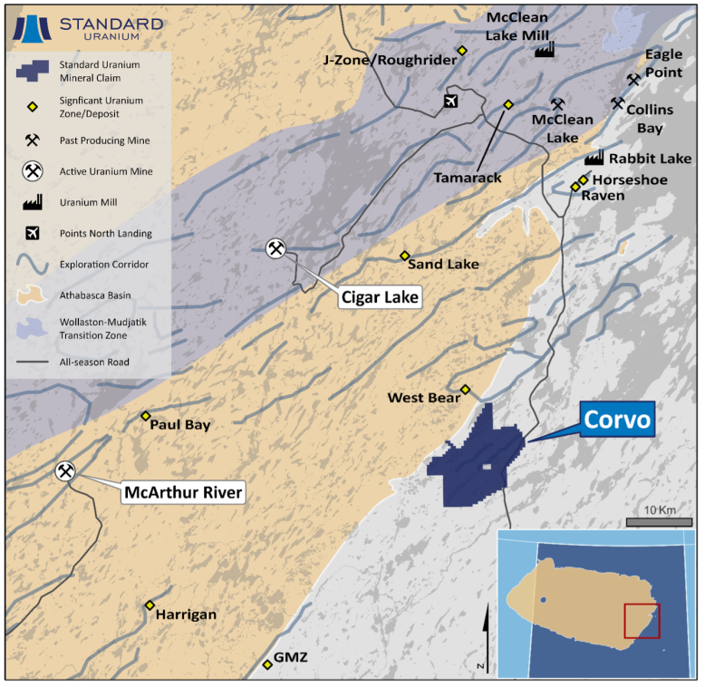 Figure 1. Regional map of Standard Uranium’s Corvo Project. The Project is located 45 km northeast of the Gemini Mineralized Zone (“GMZ”) and 60 km due east of Cameco’s McArthur River mine.