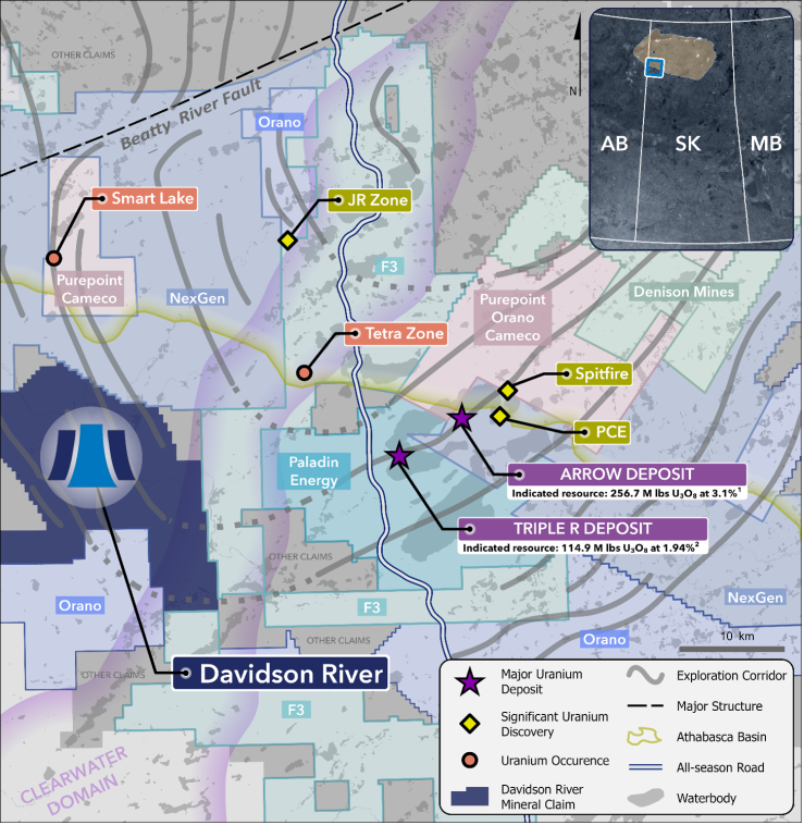 Davidson River is Standard Uranium’s flagship property, located in the southwest Athabasca Uranium District of the Athabasca Basin, Saskatchewan, and encapsulates the inferred extension of the structural trend that hosts the Triple R and Arrow uranium deposits (Figure 1). The Project consists of 10 contiguous mineral dispositions and lies approximately 25 to 30 km west of Arrow and Triple R and 75 km south of the past-producing Cluff Lake uranium mines. The Company has completed 16,561 metres of diamond drilling in 39 drill holes on the Davidson River property since 2020, which has further refined the exploration strategy for high-grade basement hosted uranium mineralization on the property3.