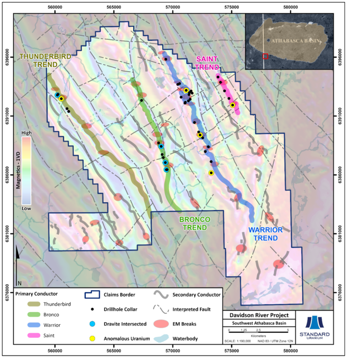 Figure 1. Overview of Standard Uranium’s Flagship Davidson River Project in the southwest Athabasca Basin uranium district along trend from significant uranium discoveries and resources1,2.