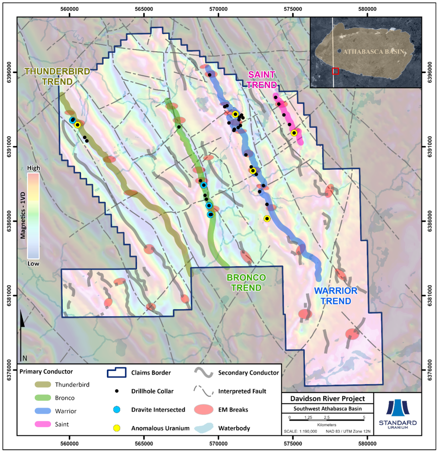 Figure 1. Overview of Standard Uranium’s Flagship Davidson River Project in the southwest Athabasca Basin uranium district along trend from significant uranium discoveries and resources1,2.