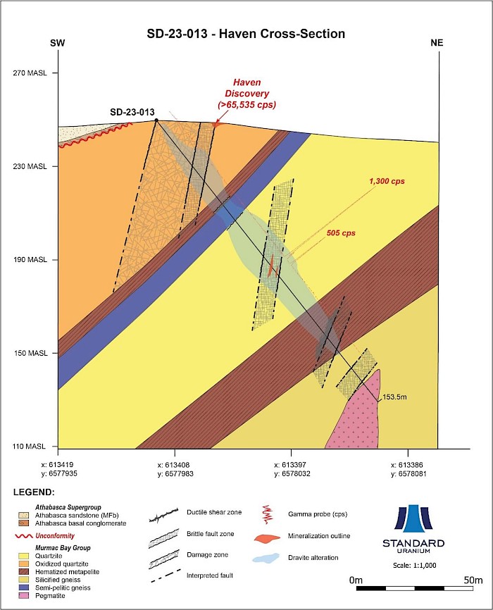 - Elevated radioactivity over a total of 1.5 metres up to 1,300 counts per second (cps)* intersected in drill hole SD-23-013 at the Haven discovery.