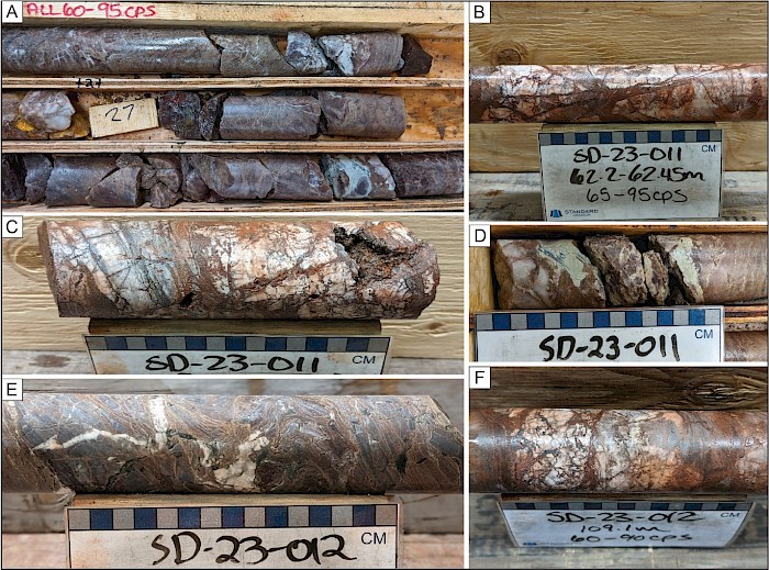 - Down-dip follow up of surface mineralization up to 45,000 cps west along strike of hole SD-23-011