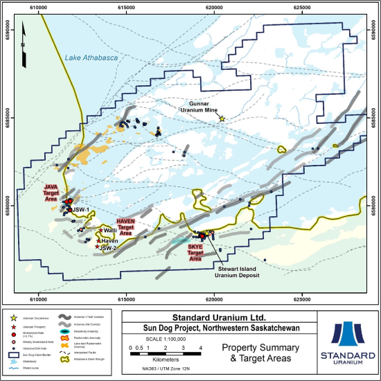 Standard Uranium is a mineral resource exploration company based in Vancouver, British Columbia. Since its establishment, Standard Uranium has focused on the identification and development of prospective exploration stage uranium projects in the Athabasca Basin in Saskatchewan, Canada. Standard Uranium’s Davidson River Project, in the southwest part of the Athabasca Basin, Saskatchewan, is comprised of 21 mineral claims over 25,886 hectares. The Davidson River Project is highly prospective for basement hosted uranium deposits yet remains relatively untested by drilling despite its location along trend from recent high-grade uranium discoveries. A copy of the NI 43-101 technical report that summarizes the exploration on the Davidson River Project is available for review under Standard Uranium’s SEDAR profile (www.sedar.com).