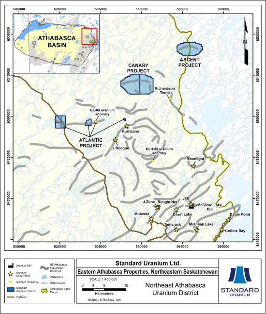 Figure 3. Plan map highlighting Standard Uranium’s Eastern Athabasca Projects and exploration trends, with respect to current uranium showings, discoveries, and deposits.