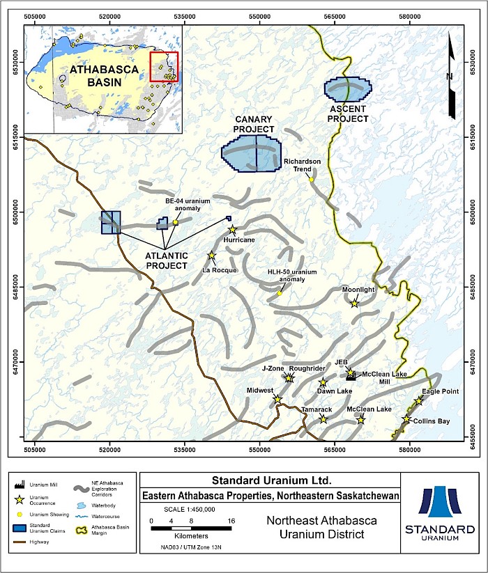 Figure 4. Plan map highlighting Standard Uranium’s eastern Athabasca Projects and exploration trends, with respect to current uranium showings, discoveries, and deposits.