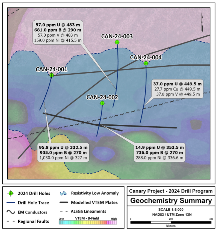 - Uranium Mineralization Confirmed: Analytical results from the spring 2024 drill program at the Project confirmed moderately anomalous uranium in drill holes CAN-24-001 and CAN-24-003 with Uranium:Thorium (“U:Th”) ratios ≥3:1, indicating hydrothermal uranium input.