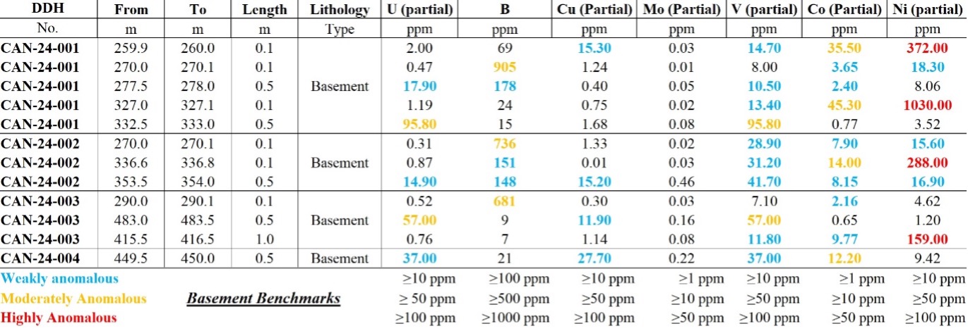 - Elevated Uranium Pathfinders: Several key uranium pathfinder elements are present in anomalous quantities in multiple drill holes within the crystalline basement, providing vectoring information for future programs; anomalous Boron is particularly common. Spectroscopy confirms presence of fracture-hosted dravitic-clay (13.4%) associated with semi-pelitic gneiss in drill hole CAN-24-001.