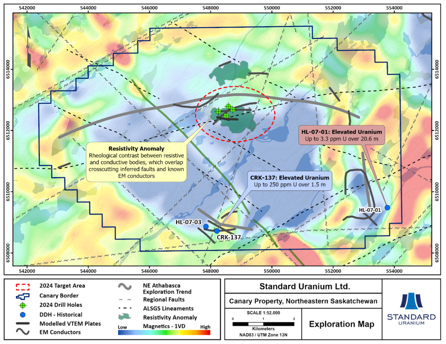 Vancouver, British Columbia, September 19, 2024 — Standard Uranium Ltd. (“Standard Uranium” or the “Company”) (TSX-V: STND) (OTCQB: STTDF) (Frankfurt: FWB:9SU) is pleased to announce a summary of analytical results from the inaugural spring 2024 drill program at its 7,302-hectare Canary Project (“Canary” or “the Project”) highlighting localized anomalous uranium and pathfinder elements typical of basement-hosted uranium deposits. Canary is situated in the prolific eastern Athabasca Basin, northern Saskatchewan (Figure 1).