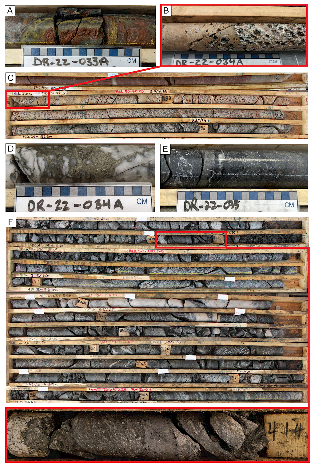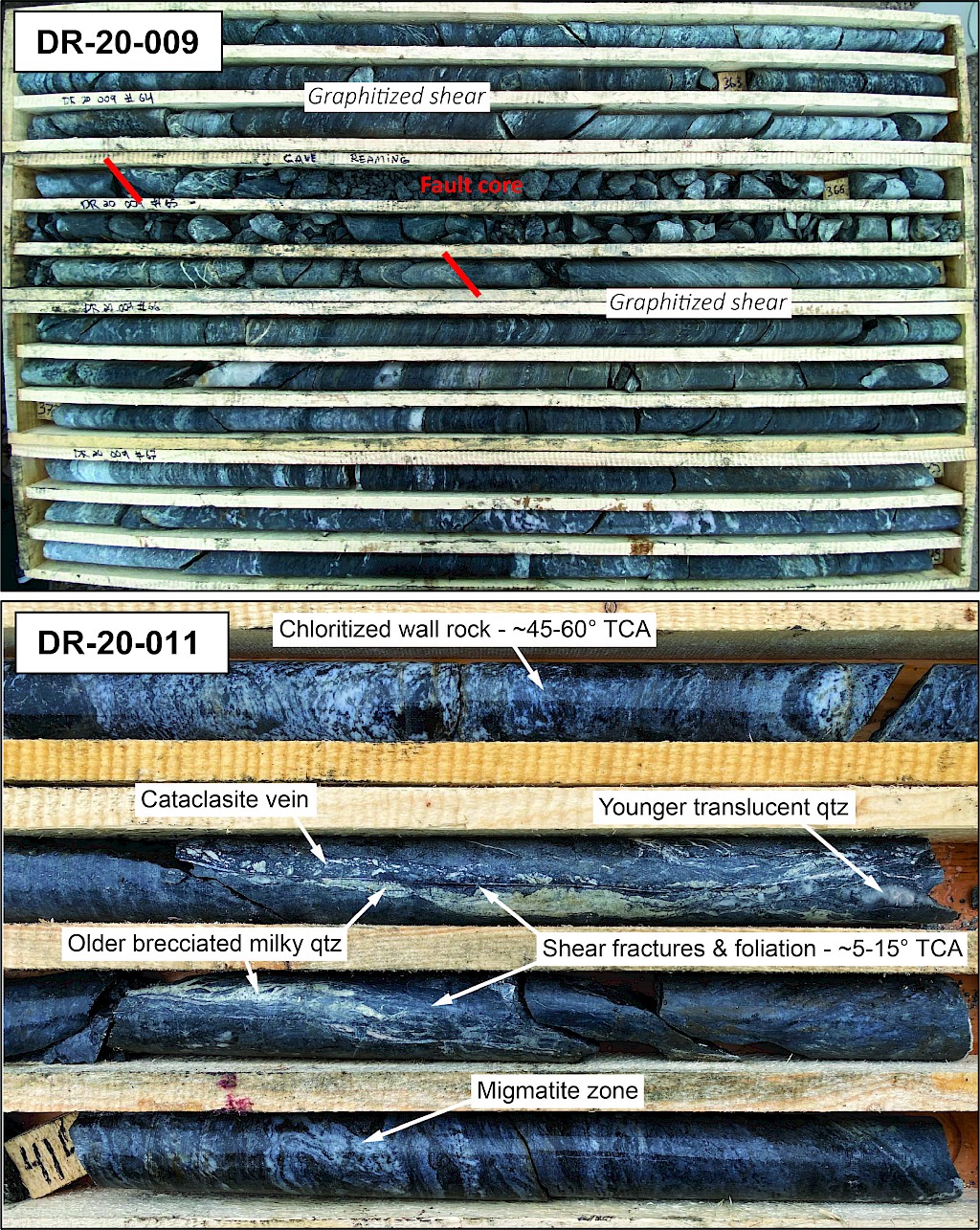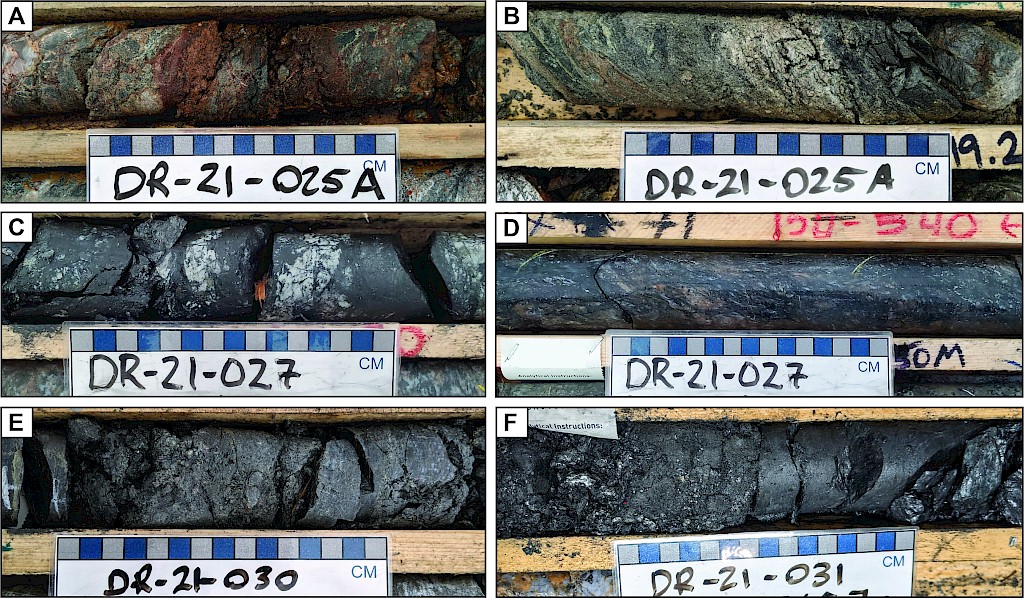 Favorable basement rock types and alteration phases have been observed across the strike length of the main trends, resembling those which host other uranium deposits in the southwestern Athabasca Basin region. Key indicators include clay-dravite alteration and stacked lenses of variably strained graphite and sulphide-bearing garnetiferous gneisses and altered feldspar-rich rocks. Elevated uranium values in the basement rocks are dominantly associated with deformed metasedimentary units and coarse-grained pegmatites. Structural zones in the basement are locally associated with elevated uranium and/or boron values (over 1,000 ppm B), such as in DR-20-009 and -011 (Photo 1).