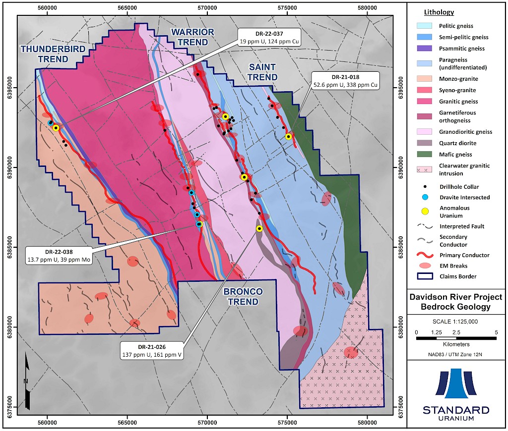 Davidson River is Standard Uranium’s flagship property, located in the southwest Athabasca uranium district of the Athabasca Basin, Saskatchewan, and encapsulates the inferred extension of the structural trend that hosts Fission Uranium’s Triple R deposit and NexGen Energy’s Arrow deposit (Figure 1). The project consists of 10 contiguous mineral dispositions totaling 30,737 hectares and lies approximately 25 to 30 km west of Arrow and Triple R and 75 km south of the past-producing Cluff Lake uranium mines. The Company has completed 16,561 metres of diamond drilling in 39 drill holes on the Davidson River property since 2020, which has further refined the exploration strategy for high-grade basement hosted uranium mineralization on the property. The flagship property hosts four main conductive corridors – the Warrior, Bronco, Thunderbird, and Saint trends (Figure 2). All four geophysical corridors contain several target areas favorable for high-grade basement hosted uranium mineralization.