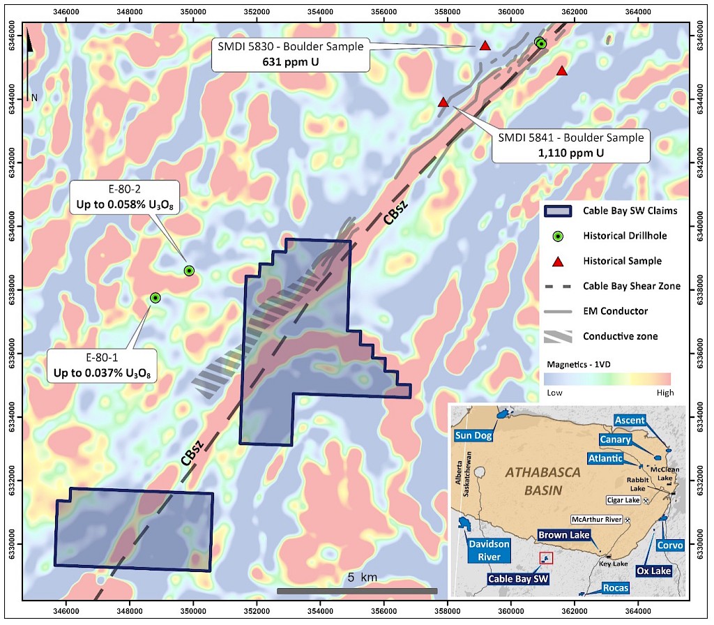 The CBSW project comprises two mineral claims totalling 3,158 ha and is approximately 18 km south of the present-day margin of the Athabasca Basin. The project covers 8.6 km of the northeast trending Cable Bay Shear Zone (“CBSZ”), a major structural discontinuity which is host to several uranium occurrences proximate to and along strike of the structural corridor on the property. The CBSZ is characterized by a regional magnetic high corridor flanked by magnetic gradients. Electromagnetic (“EM”) surveys conducted in the late 1970’s outline an EM zone associated with a magnetic low, paralleling the northwestern flank of the CBSZ. The northern claim block covers an apparent left-lateral break in the magnetic high corridor, with the eastern splay of magnetic high tying into the hinge of an interpreted fold structure of metasedimentary rock units on the property. The Project has never been drill-tested, and will benefit from additional surface sampling and geophysical surveys to aid in future drill target generation.